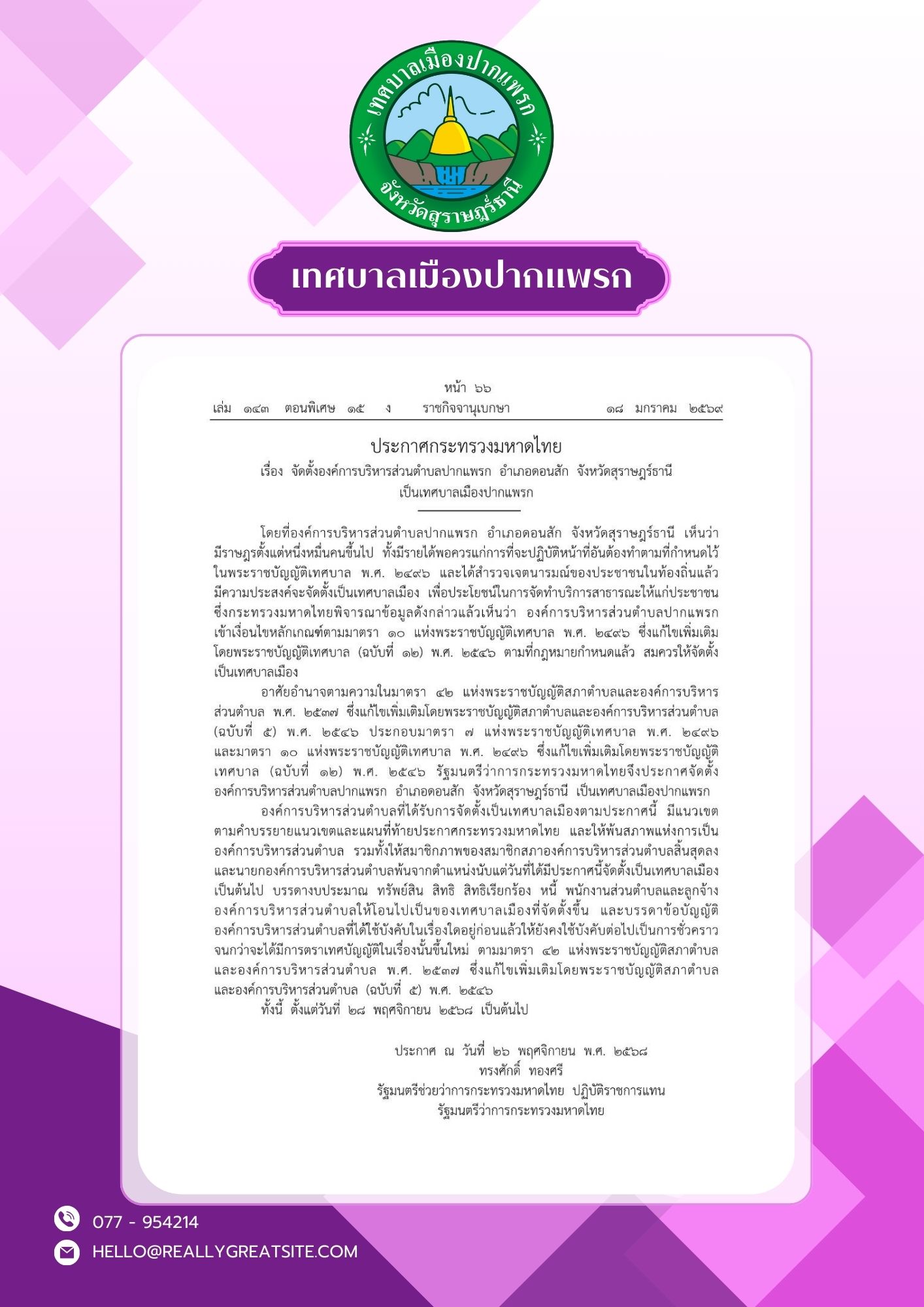 เทศบาลเมืองปากแพรก อำเภอดอนสัก จังหวัดสุราษฎร์ธานี : www.pakprak.go.th